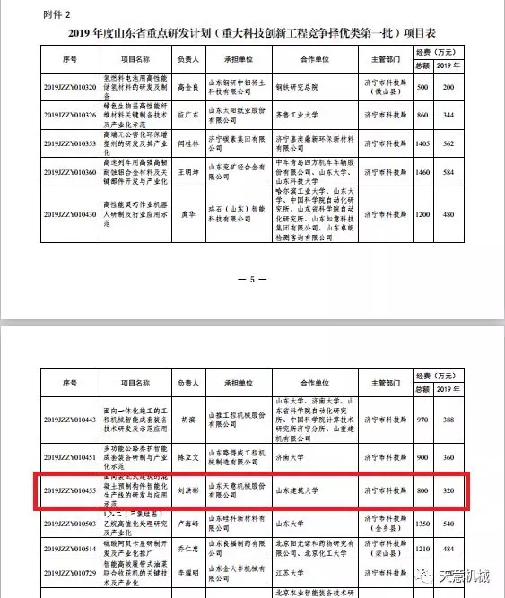 天意機(jī)械面向裝配式建筑的混凝土預(yù)制構(gòu)件智能化生產(chǎn)線的研發(fā)與應(yīng)用項目列入2019年山東省重點(diǎn)研發(fā)計劃,總計資金支持800萬元。