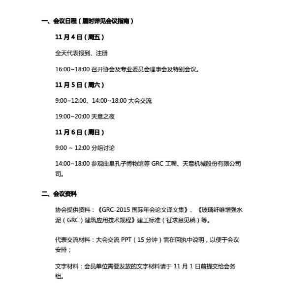 2014 年南京年會(huì)以來的新技術(shù)、新材料和新裝備成果;展示上海迪士尼GRC 典型示范工程風(fēng)采;研討 GRC 技術(shù)與產(chǎn)品研發(fā)方向;匯報(bào) 2015 年迪拜國(guó)際 GRC 年會(huì)及國(guó)際 GRC 發(fā)展方向;介紹《玻璃纖維增強(qiáng)水泥(GRC)建筑應(yīng)用技術(shù)規(guī)程》建工標(biāo)準(zhǔn)制定情況;觀摩曲阜孔子博物館等 GRC 工程。為滿足與會(huì)者的要求,大會(huì)還將特邀相關(guān)部門專家作裝配式建筑發(fā)展導(dǎo)向性報(bào)告。